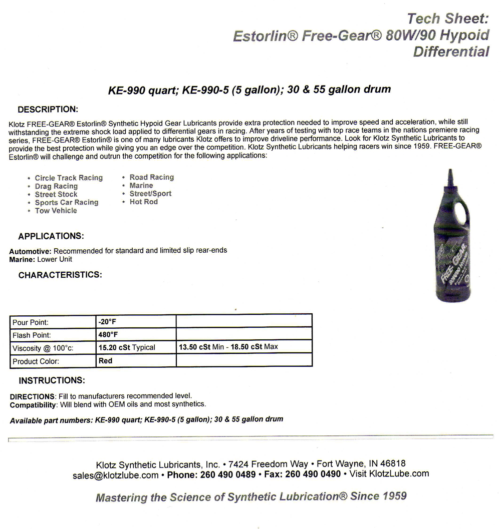 Klotz FREE-GEAR® Estorlin® Synthetic Hypoid Gear Lubricants provide extra protection needed to improve speed and acceleration, while still withstanding the extreme shock load applied to differential gears in racing. After years of testing with top race teams in the nations premiere racing series, FRRE-GEAR® Estorlin® is one of the many lubricants Klotz offers to improve driveline performance. Look for Klotz Synthetic Lubricants to provide the best protection while giving you an edge over the competition. Klotz synthetic Lubricants has been helping racers win since 1959, FREE-GEAR® Estorlin® will challenge and outrun the competition.