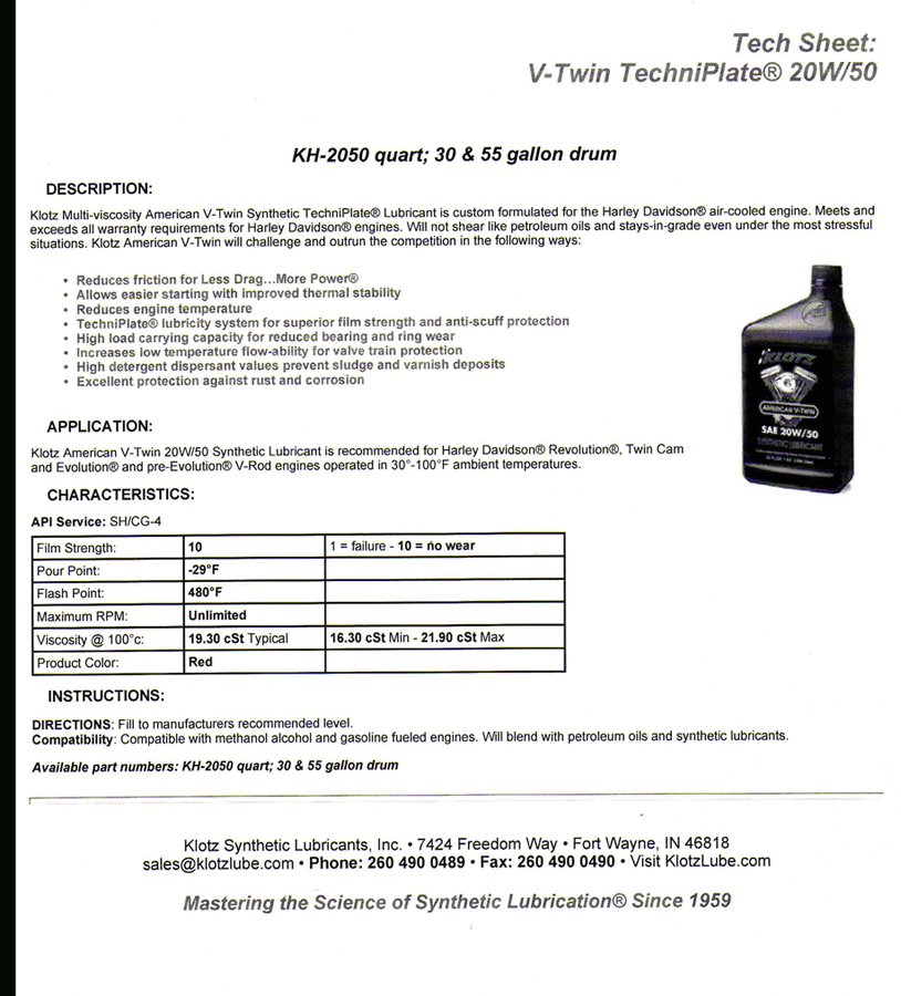 Klotz multi-viscosity American V-twin Synthetic TechniPlate® Lubricant is custom formulated for the Harley Davidson® air-cooled engine. Meets and exceeds all warranty requirements for Harley Davidson® engines. Will not shear like petroleum oils and stays in-grade even under the most stressful situations. Klotz American V-Twin will challenge and outrun the competition.