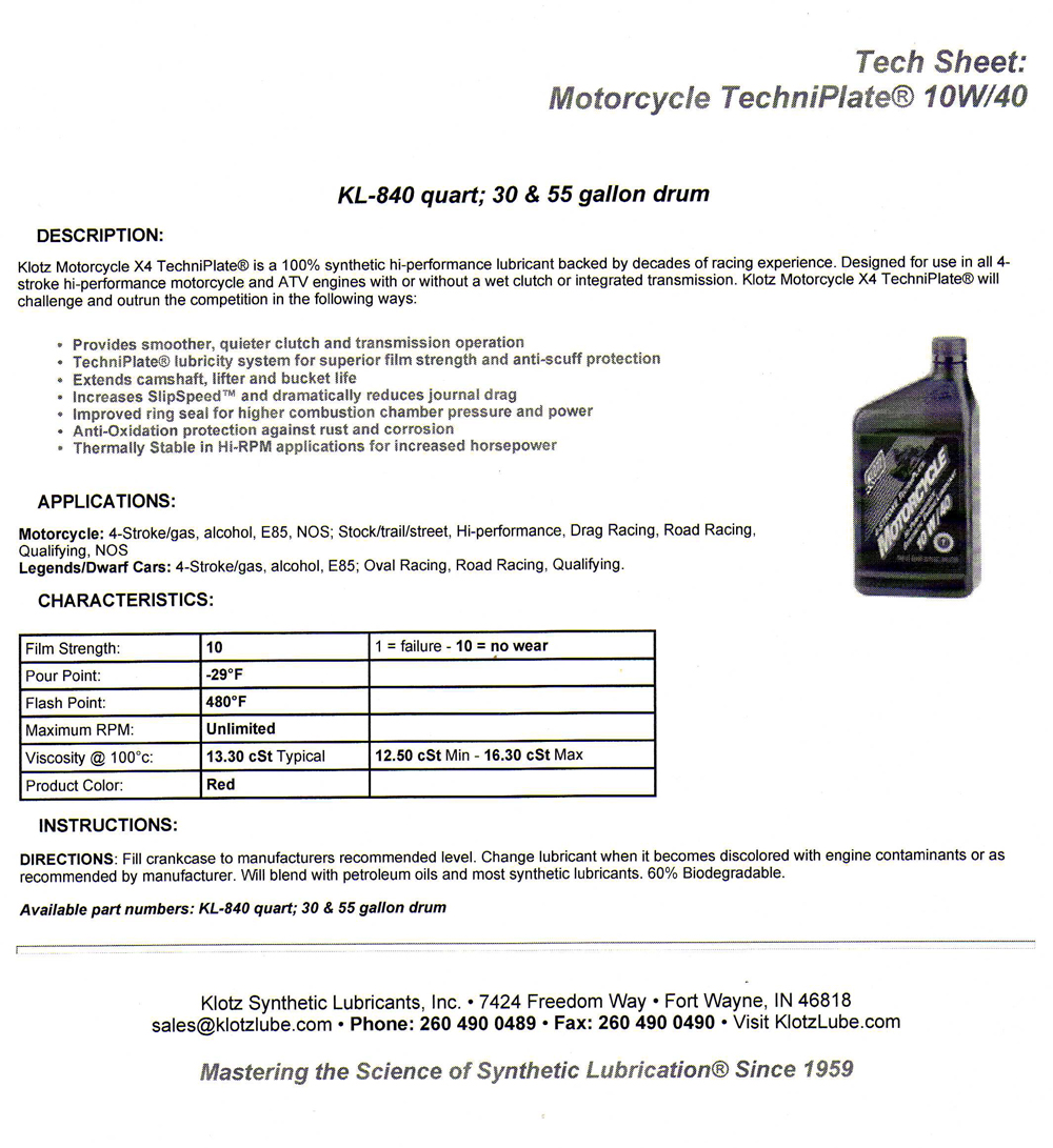 Klotz Motorcycle X4 TechniPlateŽ is a 100% synthetic hi-performance lubricant backed by decades of racing experience. Designed for use in all 4-stroke hi-performance motorcycle and ATV engines with or without a wet clutch or integrated transmission.